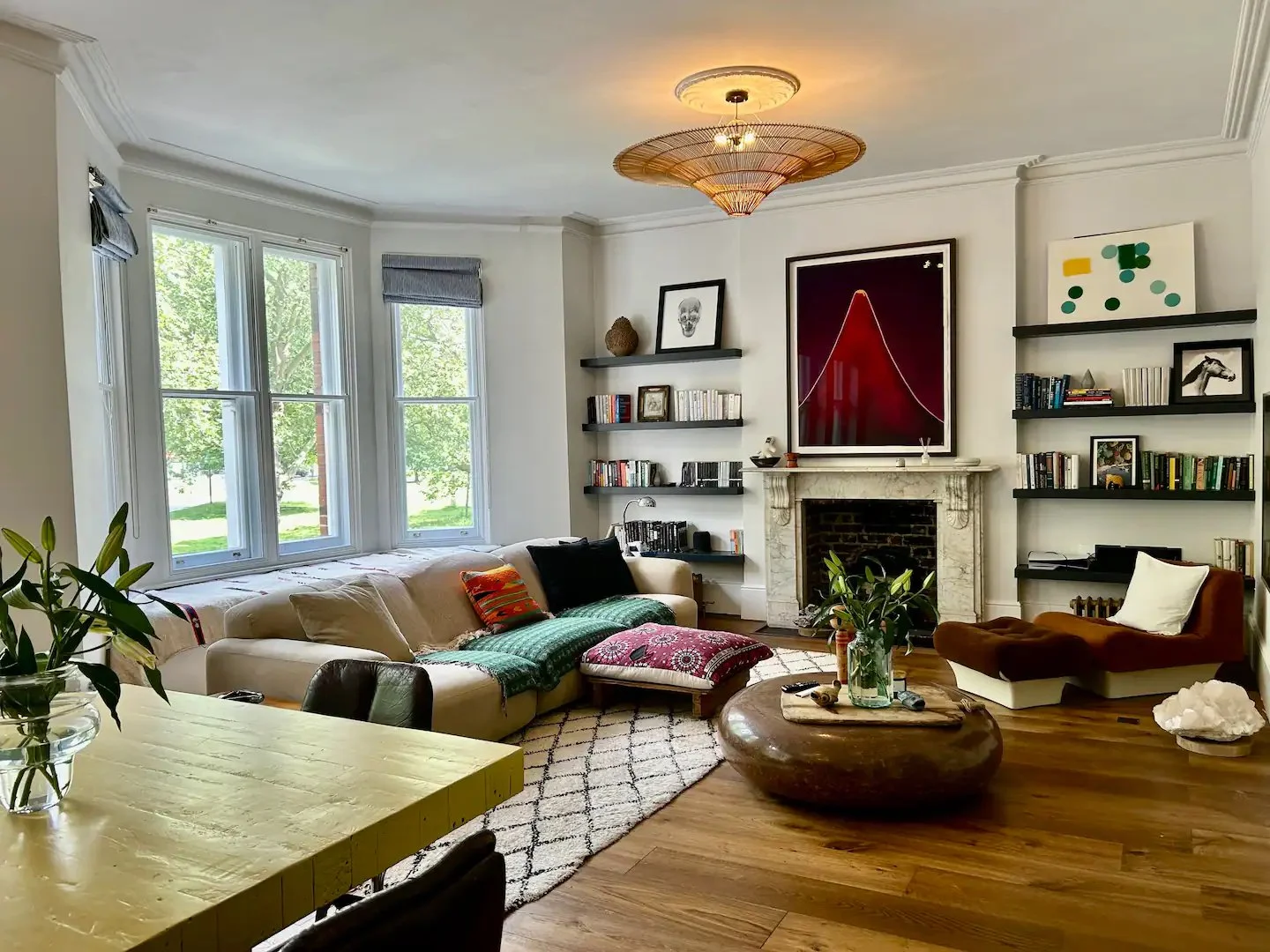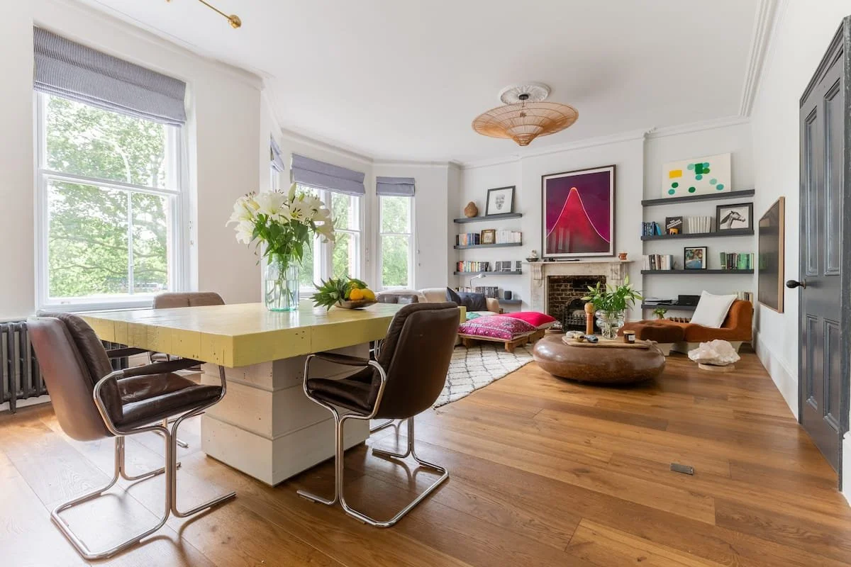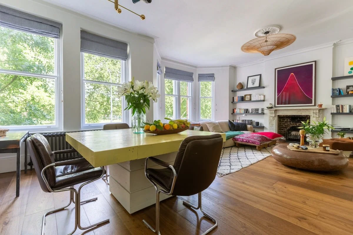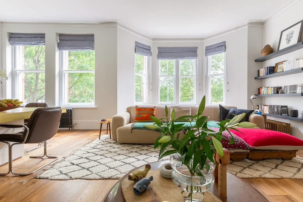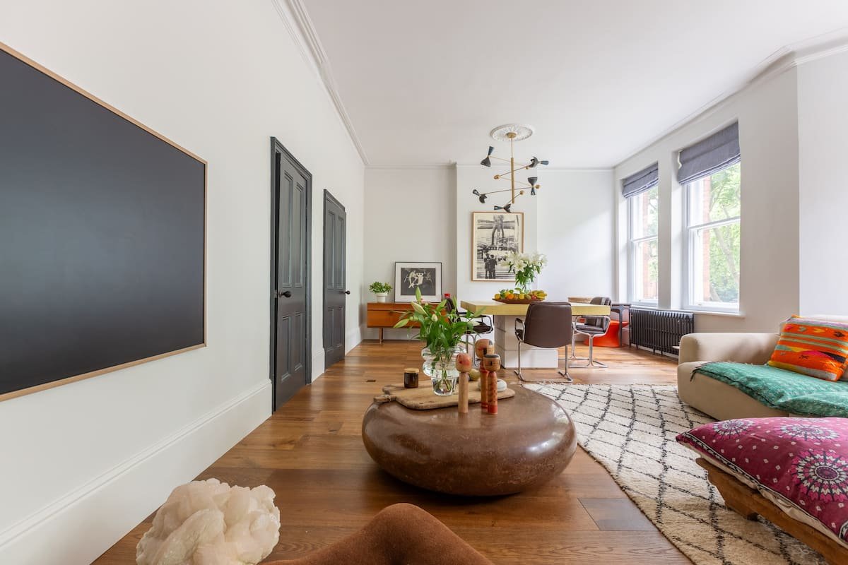 The Hideout is a New York-style apartment in the belly of London. A hybrid of Victorian, mid-century and bohemian detail all under 13 ft high ceilings and a great green view out of the 6-window living room.